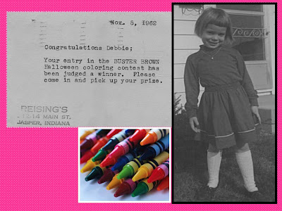 Seriously, though. Let's take a look at that postcard from another century. It is the declaration that I have won a coloring contest: Kindergarten ROCKS!! The outfit that I am modeling with those awesome wooly knee socks? That's my store-rack Buster Brown outfit that I selected as my prize!! My first experience 'shopping.' MEMORIES!