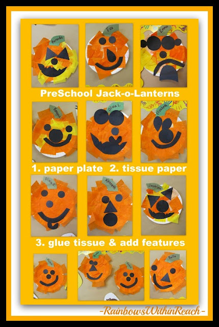 These next little jack-o-lantern 'craftivities' were created on bases of small paper plates. All the tissue papers of fall get glued next. Then adornment with simple shapes for the features make these a success for every child in the Buckeye room. Each is unique! Same basic materials, individual exploration.