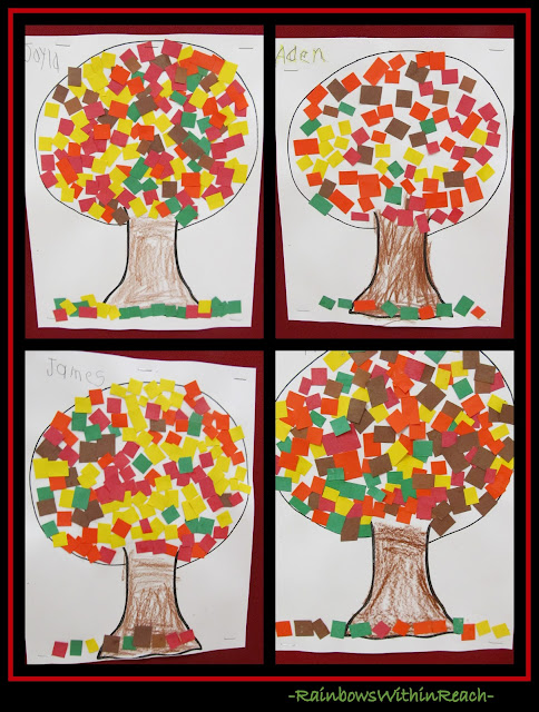 The toddler projects above use the torn construction paper for the trunk and then paint is applied for the foliage fun. It's so much fun for me (as a former Art teacher) to see the exact inverse of materials used to portray the same concept..... at different stages of development.